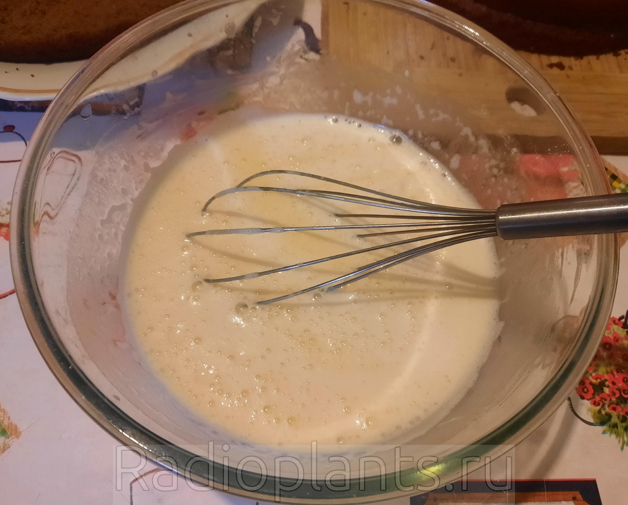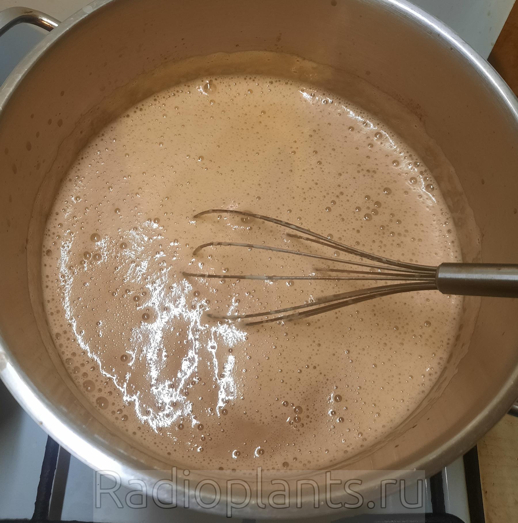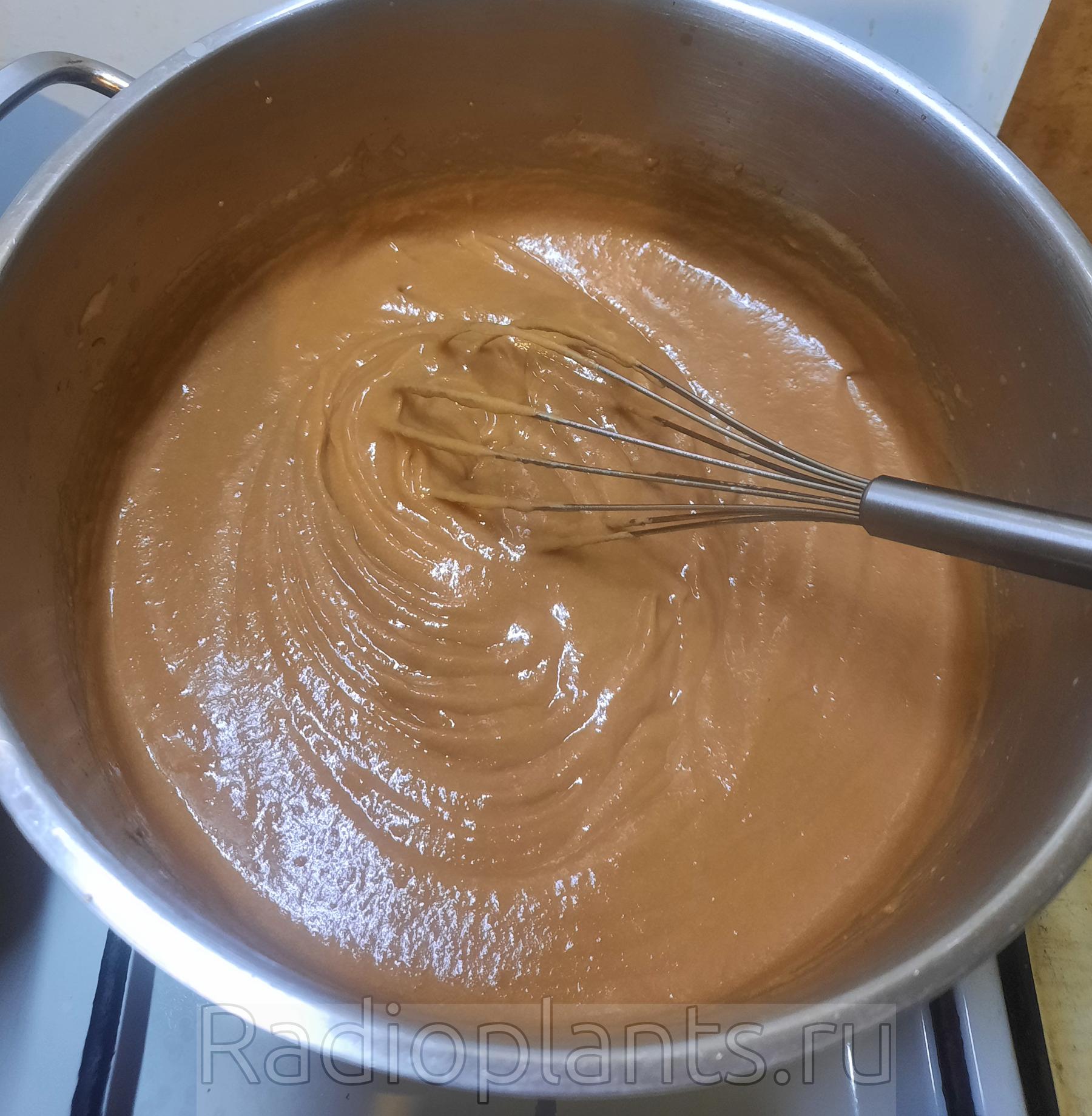 Теперь в карамельное молоко вливаем яично-мучную смесь и быстро перемешиваем венчиком.