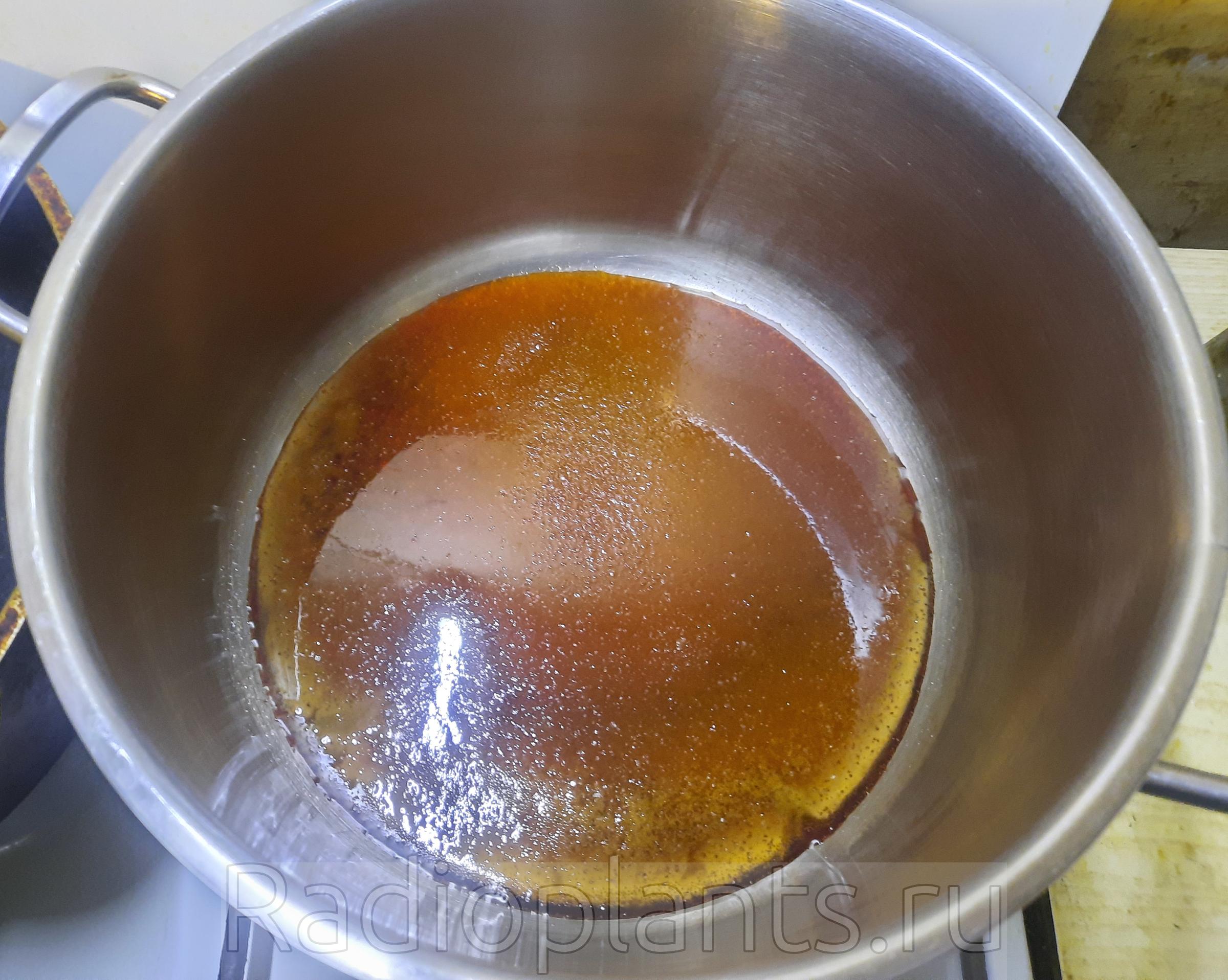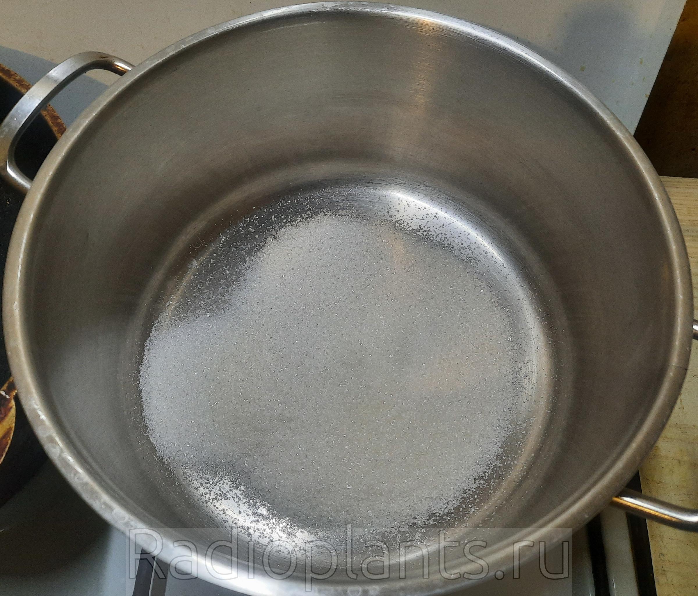 Ставим на маленький огонь кастрюлю с толстым дном и всыпаем туда сахар. Не мешаем, а ждём пока сахар полностью растает. Можно лишь немного сдвигать растаявший сахар от краёв к центру, чтобы он не подгорал.