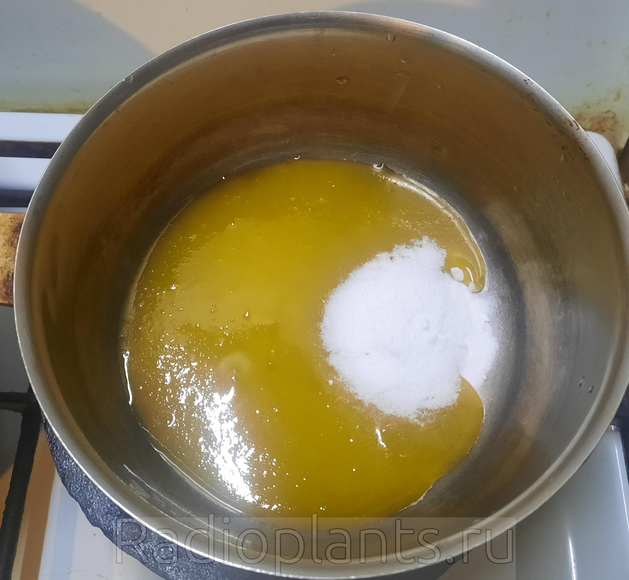 Ставим на маленький огонь мёд с содой и нагреваем непрерывно помешивая, пока цвет не станет янтарным. На это уйдет около 3-х минут. Сода способствует более быстрой карамелизации.