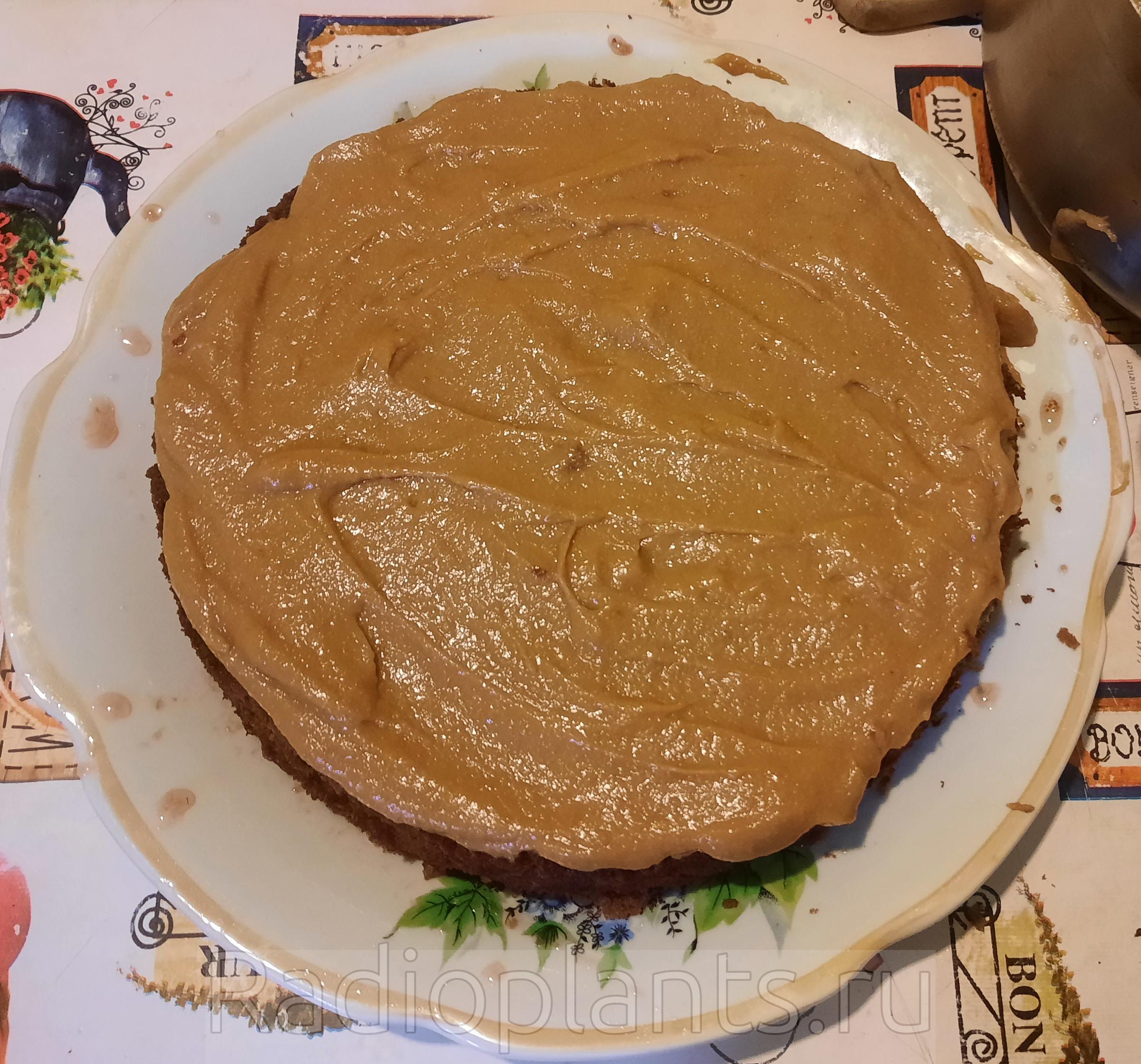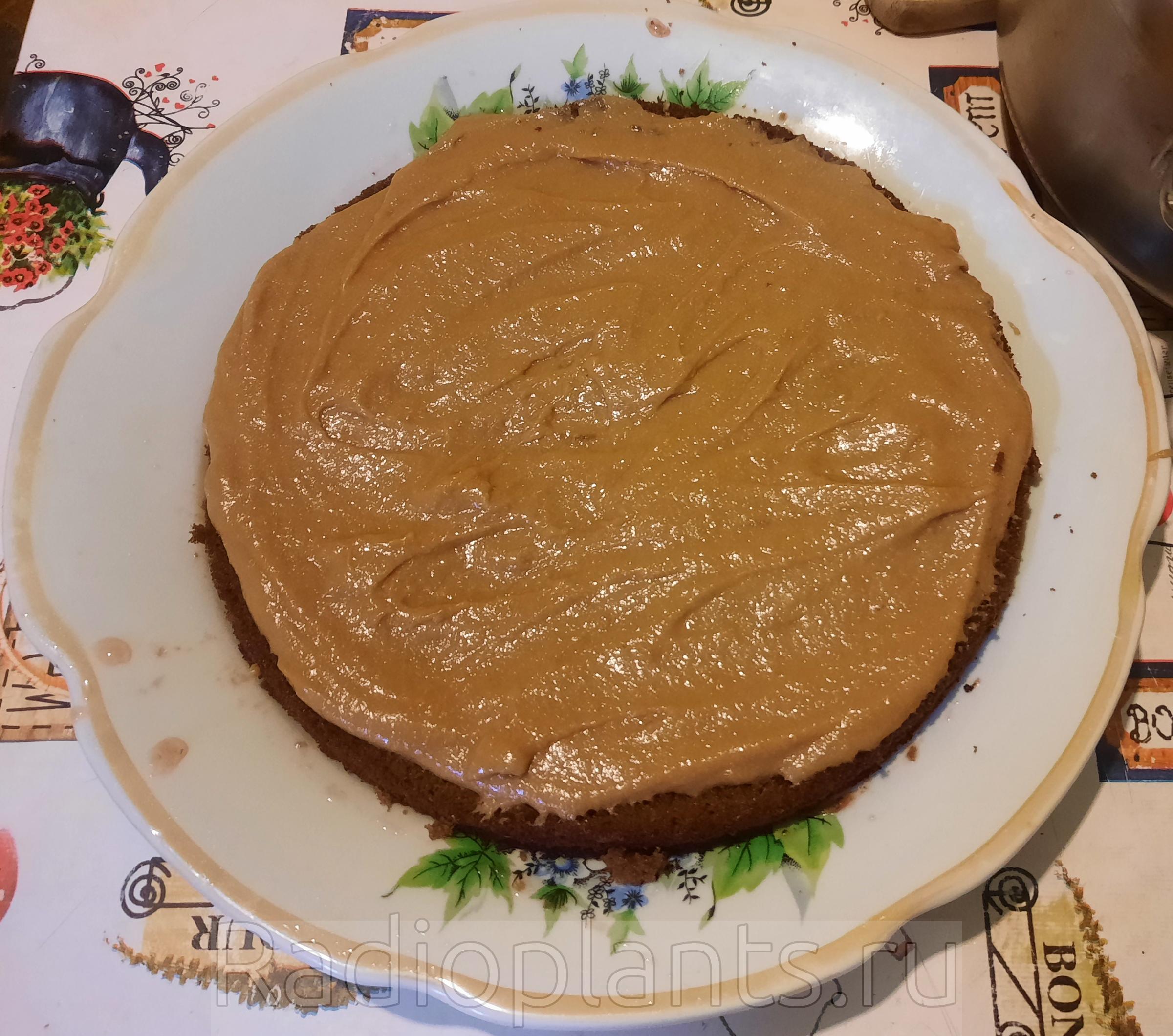 Пропитываем первый корж, затем смазываем кремом, кладём следующий корж, потом опять пропитка и крем.