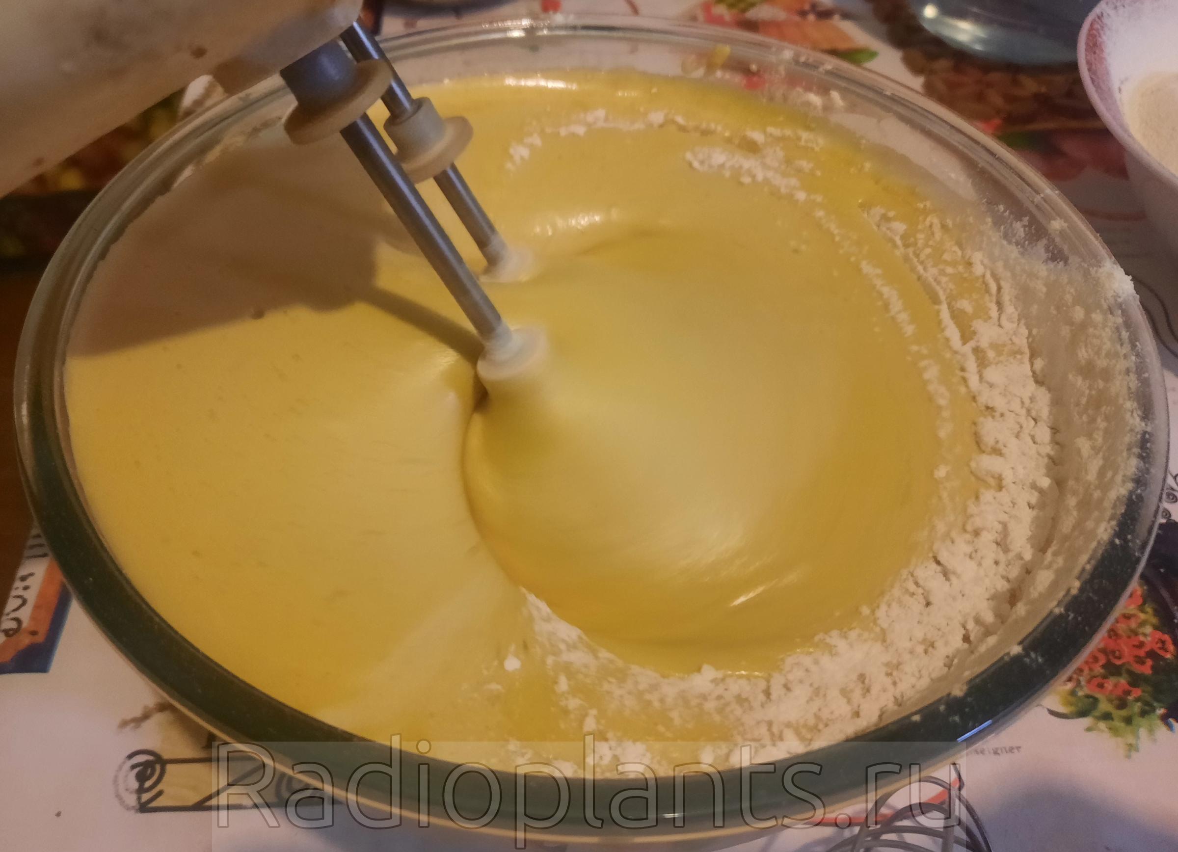 Взбиваем еще пару минут и начинаем добавлять небольшими порциями муку. Обороты миксера при этом должны быть минимальными, а можно вмешивать муку вручную, венчиком. С одной стороны нужно хорошо размешать муку, чтобы не было комочков. С другой, слишком сильное перемешивание уменьшает воздушность теста.